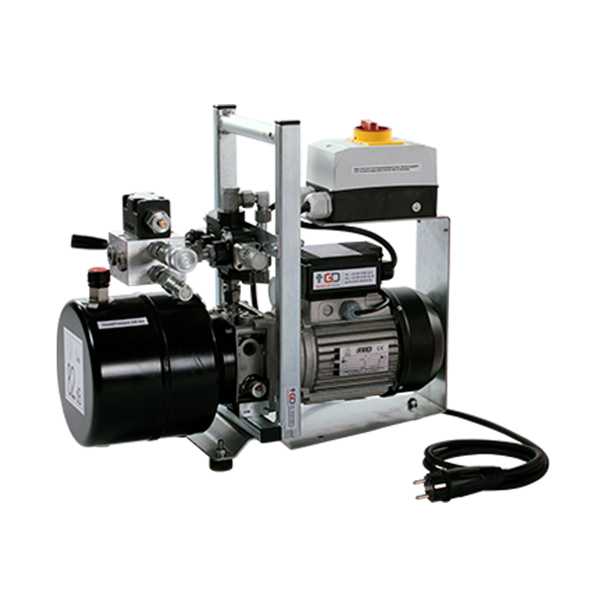 Hydraulikaggregat mit Elektroantrieb und Ziehautomatik auf kleinem, tragbaren Gestell.